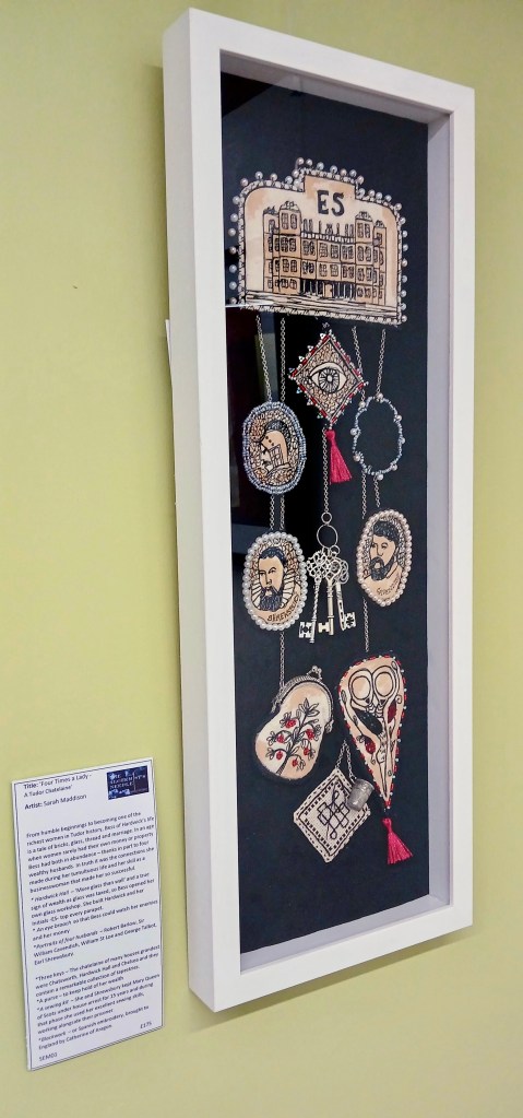 My second ‘Passionate Woman’ for the exhibition is the amazing Elizabeth Shrewsbury, perhaps better known as Bess of Hardwick. She was a most remarkable women who became the richest woman in England during the Tudor reign. There is no doubt that she married well – four times in all – but her strength really lay in her entrepreneurial ability to make her money work for her and to make the most of any situation. She built Hardwick Hall in Derbyshire, described as more glass than wall, at a time when glass was prohibitively expensive. Her solution was simple – set up her own glass workshop. She had great power and influence through her personal wealth, something few women enjoyed at this time, and at one point owned a number of great houses including Hardwick and Chatsworth. While married to Edward Shrewsbury she also became the jailer of Mary Queen of Scots for some 15 years through her friendship with Elizabeth I. Together they created unique textile art much of which survives today. She raised her own children and her stepchildren with independence and strength – she was the Chatelaine of many houses so it seems entirely appropriate to create an artwork and give Bess her own – hers has Hardwick, an all seeing Elizabethan eye, four portraits for four husbands, keys for her houses, her needlework scissors, some blackwork and of course her very own purse for all that money – a true woman of substance.